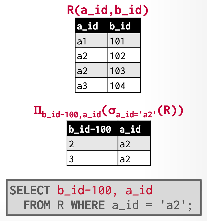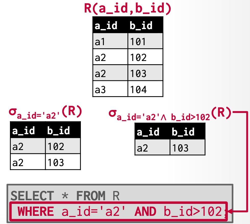 每个 operator 接受一个或多个 relation (table) 作为输入,并输出一个新的 relation。因此我们可以链式使用 operator 来做到复杂的操作。