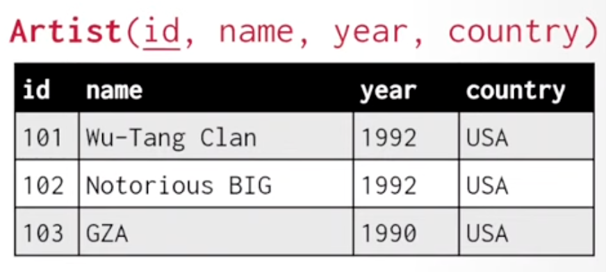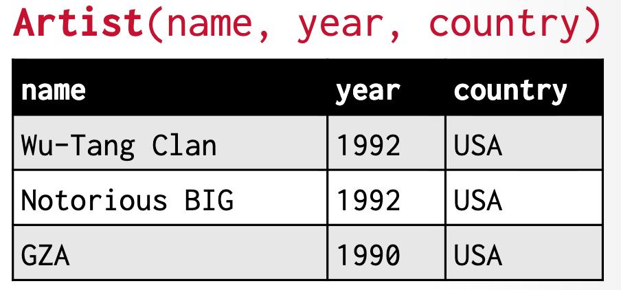 Relation 可以用 tables 表示,我们用 n 列的 table 来表示 n 元组,每一列对应一个属性。如下的 table 表示的是 Artists,它有 3 个属性:name, year, country。