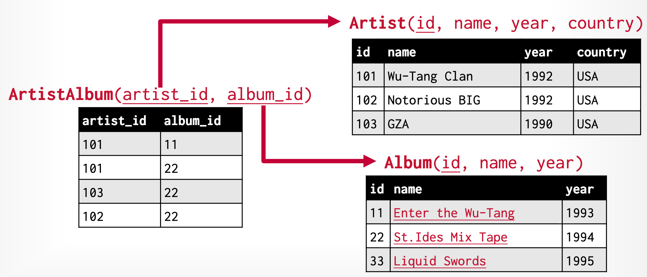 例如,我们通过一张单独的表 ArtistAlbum 维护 Album 和 Artist 之间的关系,其中使用了外键约束: